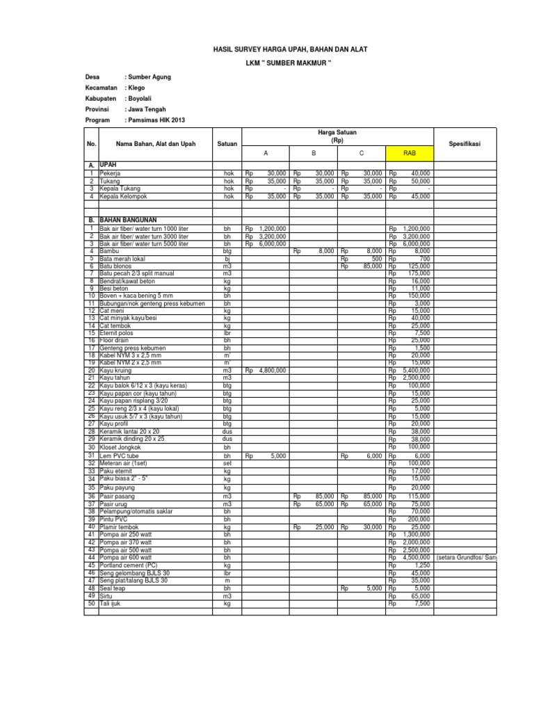 Analisa Harga Satuan Pekerjaan Sumur Bor Dalam Info Seputar Kerjaan from static.fdokumen.com Text of contoh rab excel. Konstruksi pembuatan sumur bor air tanah dalam : Rumah idamannouraian item pekerjaanjumlah harga (rp)123ipekerjaan pendahuluan795,028.00iipekerjaan tanah dan pasir1,533. O satuan (rp) (rp) 1 mobilisasi dan 2 400.000 800.000 2 demobilarasi 60 m. Rab ini sangat cocok untuk anda yang mencari referensi perhitungan anggaran biaya untuk sumur bor, terlebih lagi untuk pelajar khususnya mahasiswa. Sumur bor wonosobo adalah ahli pembuatan sumur bor yang melayani pembutan sumur bor di wonosobo. Pemboran sumur uji atau sumur uji produksi a. Rencana anggaran biaya (rab) untuk pembuatan sebuah sumur bor sangat diperlukan agar kita bisa mempersiapkan dana yang cukup untuk membuat sumur bor.